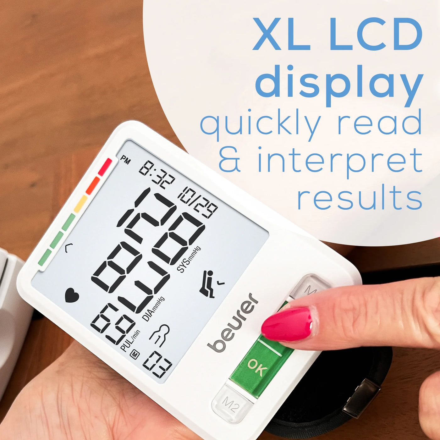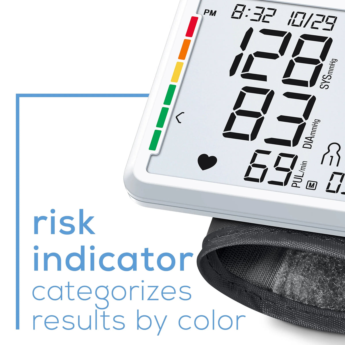 EASY TO READ: The BC87W wrist blood pressure machine has an XL LCD display to easily read your blood pressure and the color-coded risk indicator helps quickly interpret it