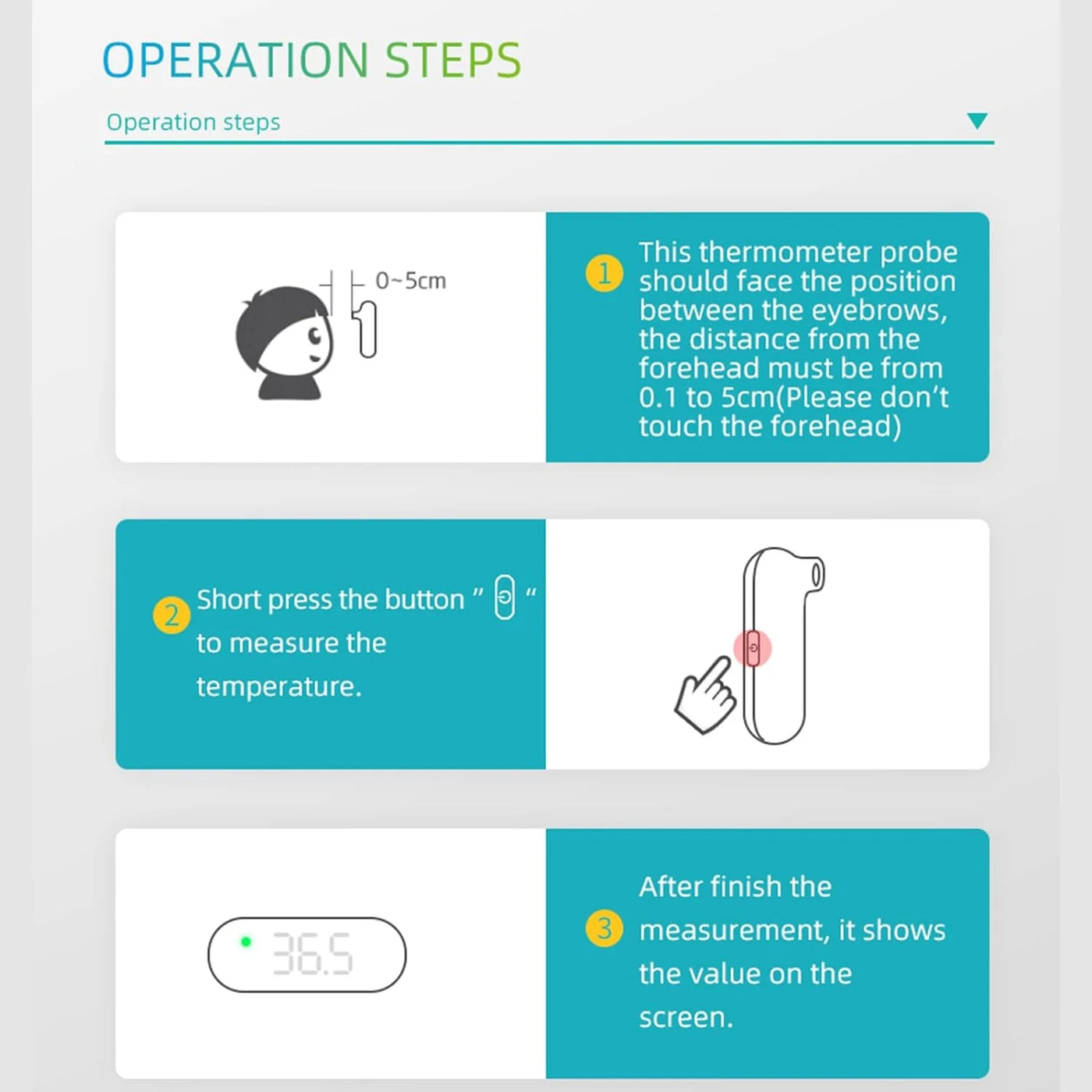 In order to have an accurate measurement, make sure the forehead thermometer and the person are measured at the same ambient temperature, and wait for 30 minutes before measuring. During measuring, the thermometer must face the position between the eyebrows. Make sure the forehead is clean and dry, the measurement site must not be covered by hair.
