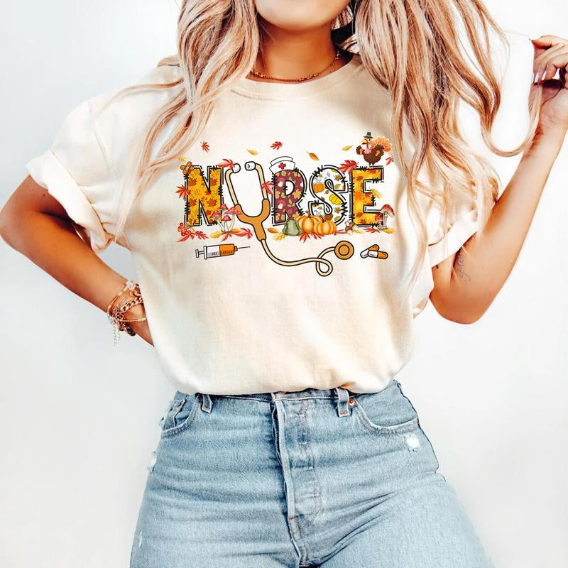 Celebrate the Thanksgiving season in style with this Thanksgiving nurse t-shirt. Designed for nurses who love the fall season, this tee is perfect for adding autumn warmth to your work shifts or casual outings during Thanksgiving and other fall gatherings. It also makes a thoughtful gift for nurses who enjoy festive attire.